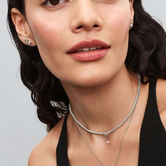 Tämä sterlinghopeinen äärettömyyssolmu tuo kaulaasi häivähdyksen vaaleanpunaista. Solmun sisälle on istutettu lakattu vaaleanpunainen tekohelmi, ja solmun kumpaakin päätä koristaa yksi säihkyvä kivi. Ketjun pituutta voi säätää liu’uttamalla riipusta. Yhtä aikaa elegantti ja pirteä vaaleanpunainen helmi voi tilanteen mukaan tuoda väriä lookiin tai tasoittaa kokonaisuutta neutraaliudellaan.