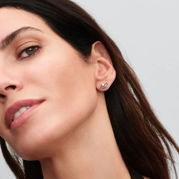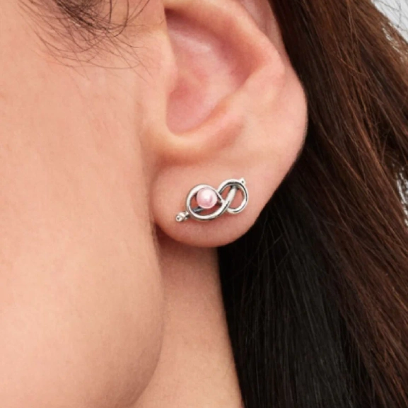 Nämä sterlinghopeiset nappikorvakorut tuovat korviisi häivähdyksen vaaleanpunaista. Lakatut tekohelmet on istutettu äärettömyyssolmujen keskelle, ja solmujen päissä on säihkyvät kivet. Yhtä aikaa elegantit ja pirteät vaaleanpunaiset helmet voivat tilanteen mukaan tuoda väriä lookiin tai tasoittaa kokonaisuutta neutraaliudellaan. Nämä korvakorut symboloivat kaikkien äärettömyyssolmun muotoisten korujemme tapaan ikuista rakkautta ja yhteenkuuluvuutta.