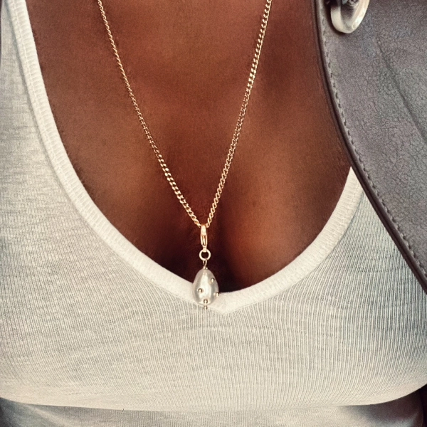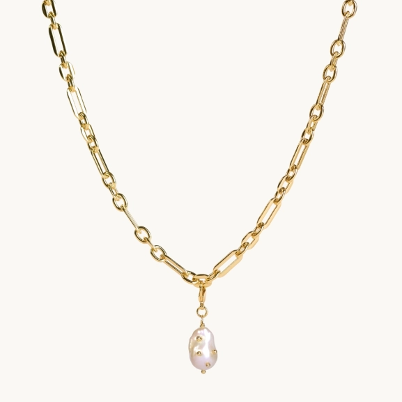 Tämä riipus yhdistää pehmeän helmiäishohdon lämpimiin kullanvärisiin yksityiskohtiin. Ainutlaatuinen makeanveden helmi, jota koristavat pienet kultaiset pallot, antaa eloisan ja elegantin vaikutelman. Emma Israelssonin koru, joka säteilee sekä lämpöä että luonnetta.