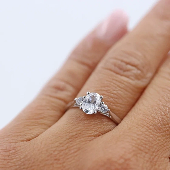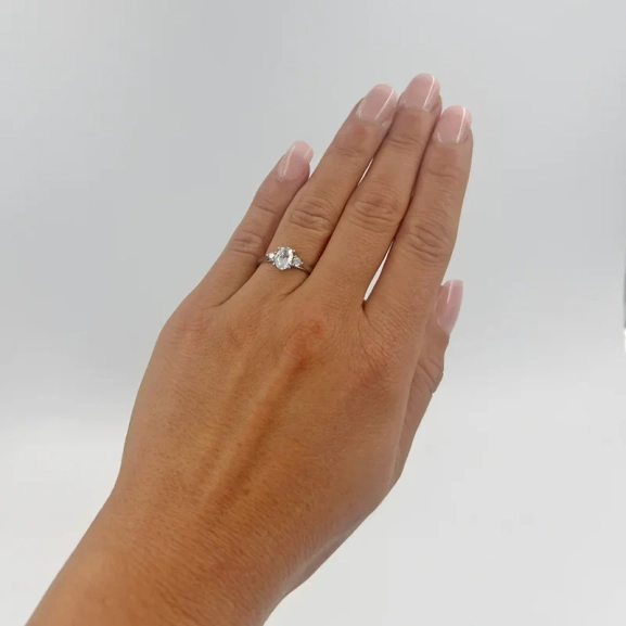 Valkokultainen 0,70 karaatin soikea timantti Eterna 21:ssä on korostettu kirkkaalla, viileällä kiillolla. Kaksi sivukiveä täydentävät keskikiveä ja luovat harmonisen ilmeen. Hienostunut kolmikivisormus, jossa yhdistyy moderni eleganssi ja klassinen symboliikka.