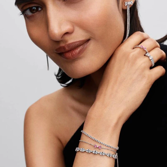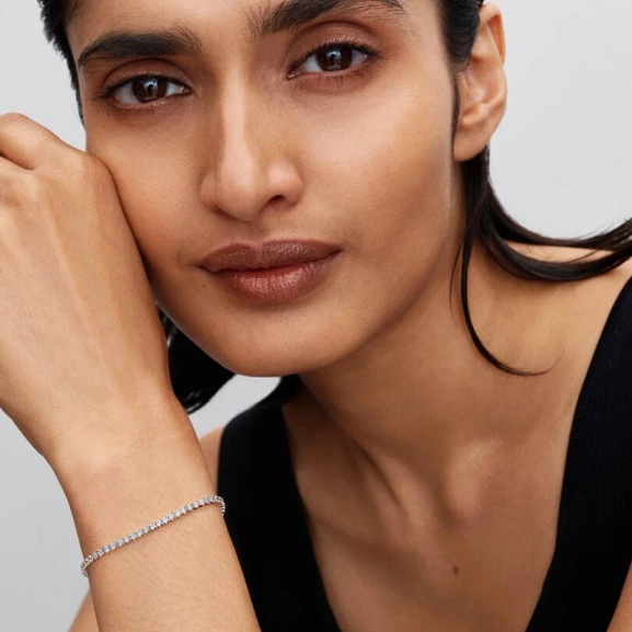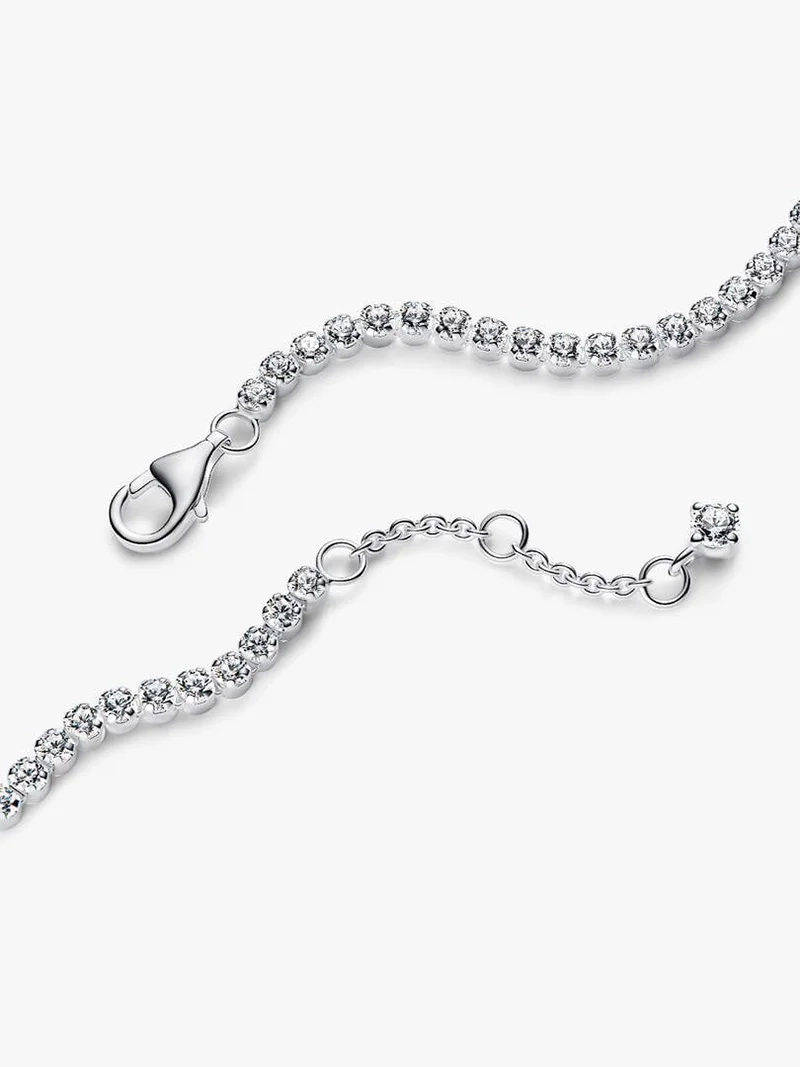 Peli, asetelma, ottelu. Nosta korutyyliäsi tällä elegantilla sterlinghopeasta valmistetulla tennisrannekkeella, jonka ympärillä on loistavia kiviä aina lukkoon asti säteilevän lopputuloksen saavuttamiseksi.