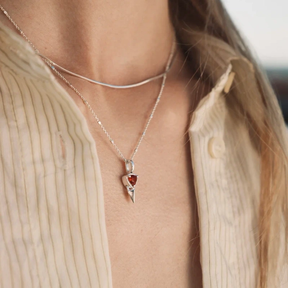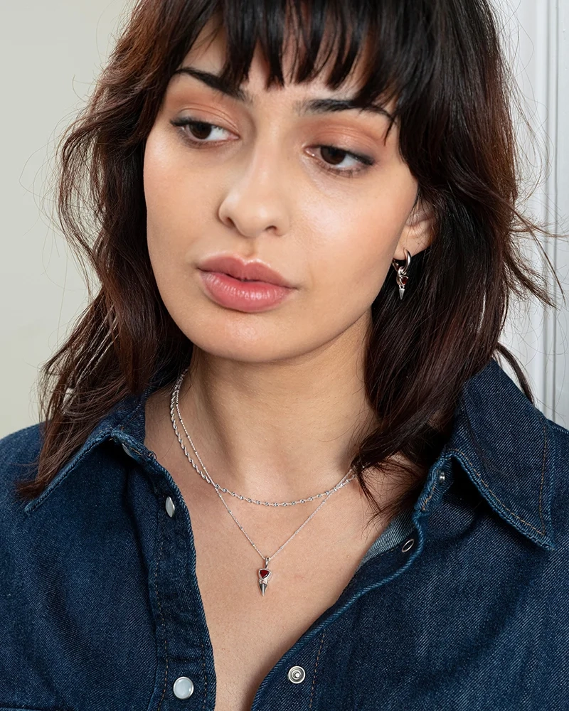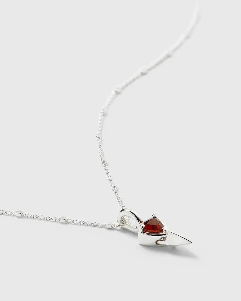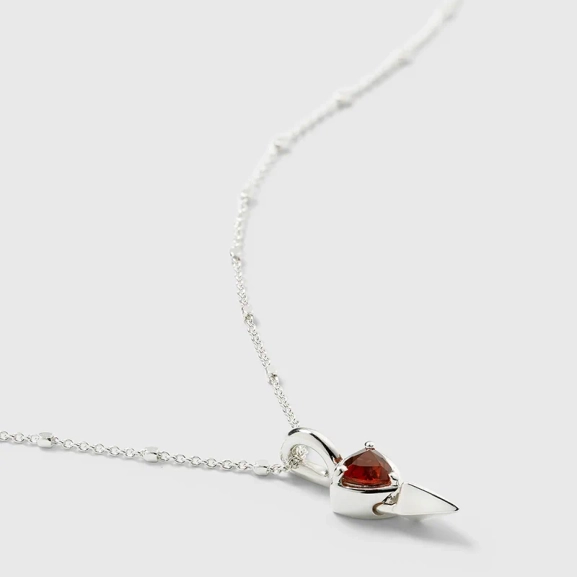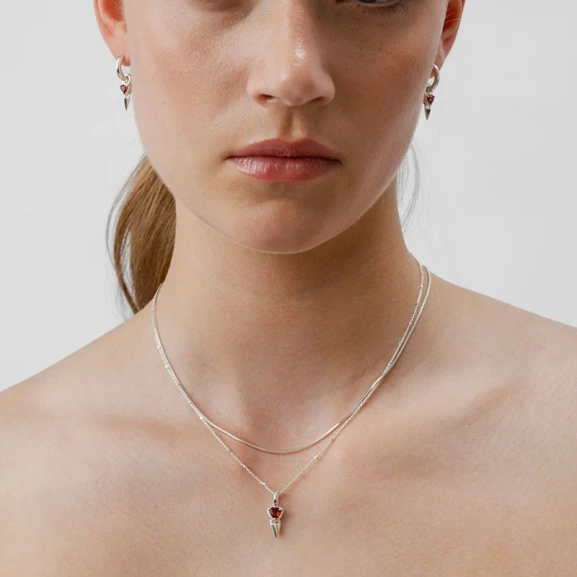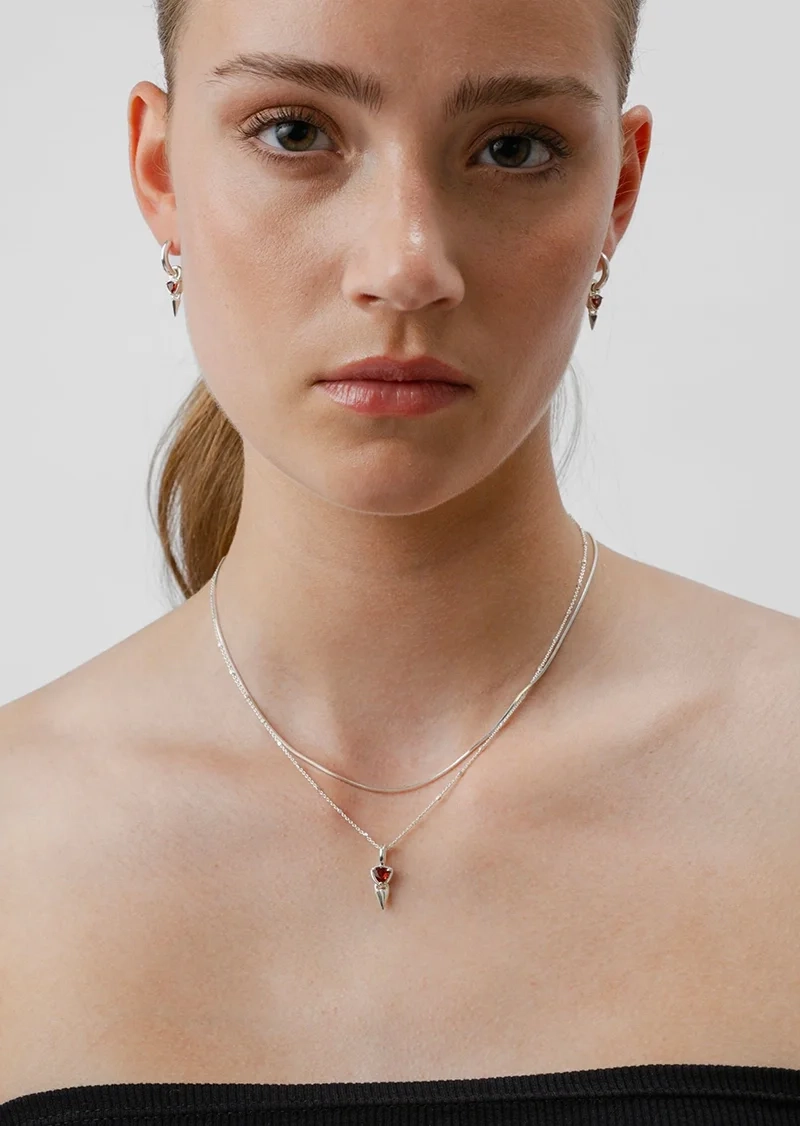 Mrs H Spike Necklace Silver – lyhyt kaulakoru ainutlaatuisella ketjulla ja terävällä riipuksella, jota koristaa kolmionmuotoinen granaatti, on täydellinen ilme muotitietoisille. Kulmikkaat yksityiskohdat antavat jännittävän tunteen, joka todella erottuu joukosta.