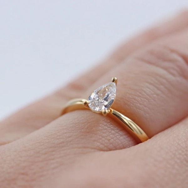 Kultainen North Dropform on tyylikäs kihlasormus, jossa on pisarahiottu laboratoriossa kasvatettu timantti. Teräväkärkinen muoto antaa sormukselle persoonallisuutta, kun taas sileä nauha luo harmonisen ja helppokäyttöisen ilmeen.