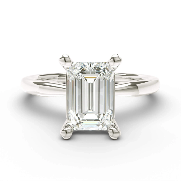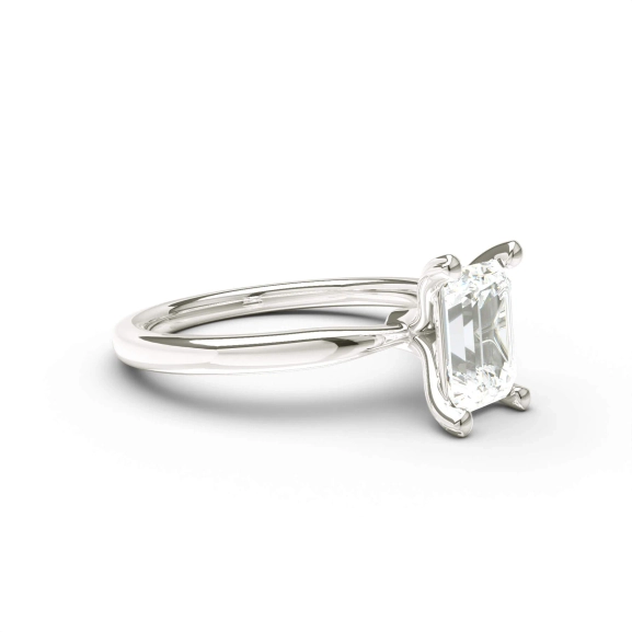 Valkokullassa sormuksen graafinen ilme ja timantin puhtaat linjat korostuvat. Smaragdihiottu timantti luo hienostuneen valonleikin, jossa painotetaan syvyyttä ja läpinäkyvyyttä, täydellinen valinta modernia klassikkoa etsiville.