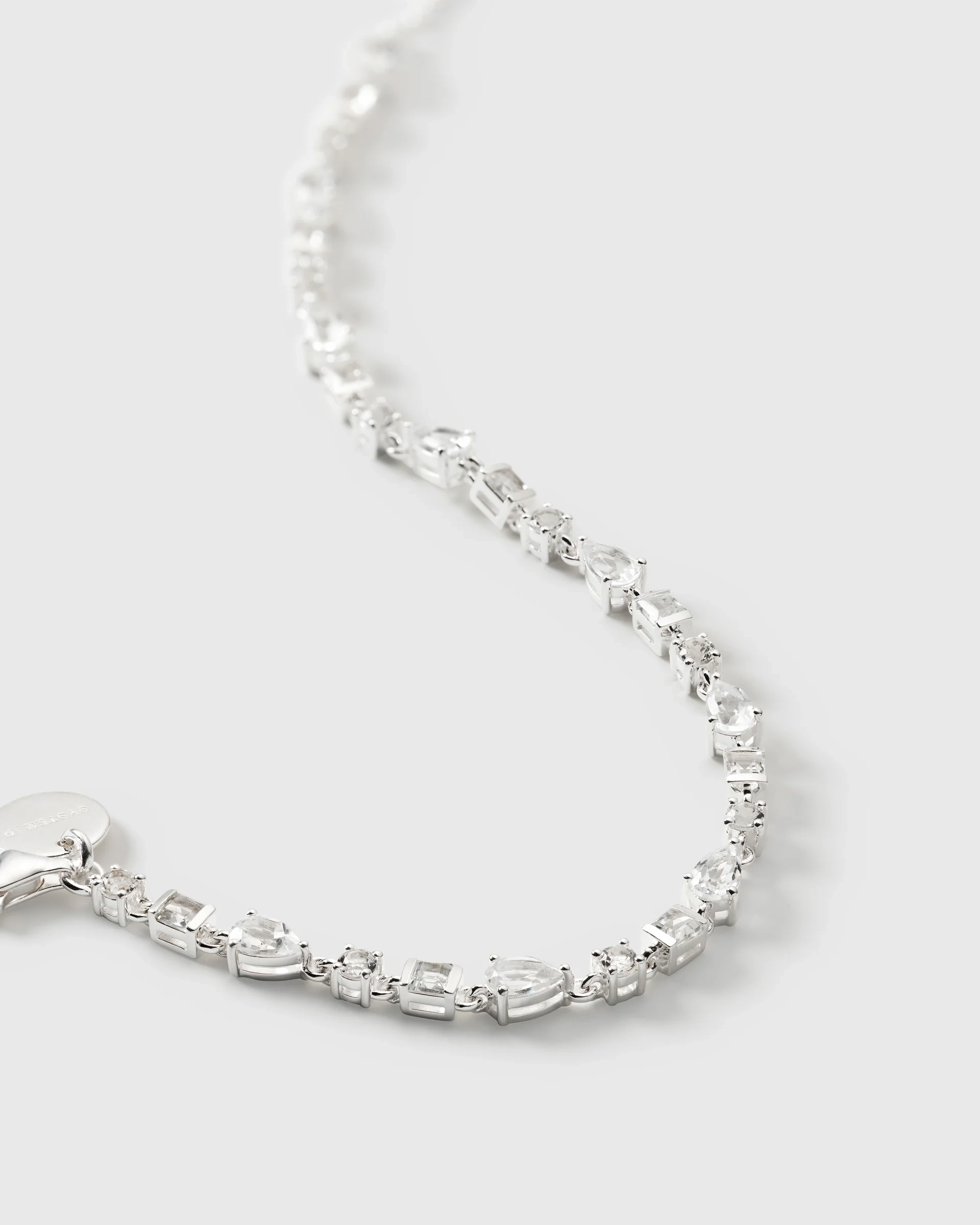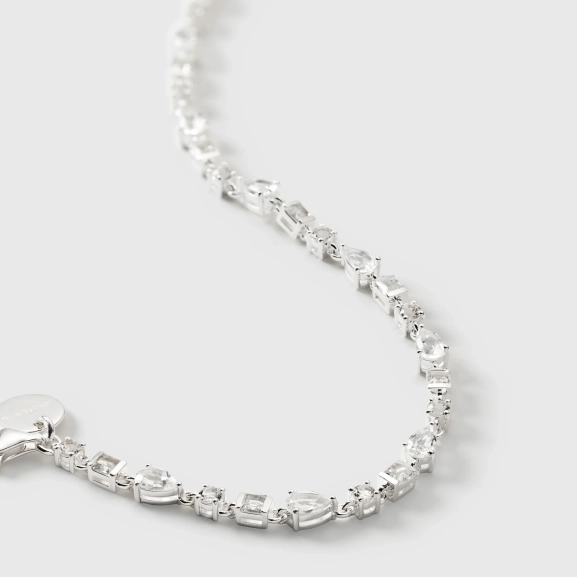 Elegantti rannekoru, jossa pienet valkoiset topaasit eri muodoissa luovat säteilevän kuvion. Klassisen tennisrannekkeen inspiroima ajaton rannekoru tulee nopeasti kokoelmasi suosikiksi. 100 % kierrätetystä sterlinghopeasta valmistettu rannekoru yhdistää kestävyyden ja tyylin. Täydellinen käytettäväksi yksinään hienovaraisen kiillon saamiseksi tai kerrostettuna muiden rannekorujen kanssa ilmeikkäämmän tyylin luomiseksi.