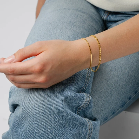 Sheer Mirror Rannekoru – Valmistettu 100 % kierrätetystä sterlinghopeasta ja päällystetty 18K kullalla, se antaa tunteen ainutlaatuisuudesta ja eleganssista. Täydellinen käytettäväksi yksinään saadakseen hienovaraisen tunteen tai yhdistettäväksi muiden rannekorujen kanssa persoonallisen tyylin luomiseksi. Tämä rannekoru on pakollinen koruvaatekaappiisi ja täydellinen lahja itsellesi tai rakastamallesi.