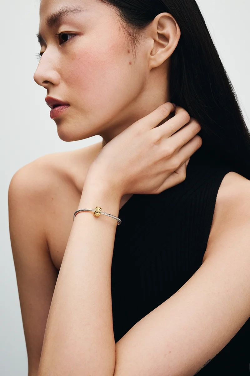 Tämä yhteensolmittujen sydänten rivillä koristeltu Pandora Moments -lukkopala on yhtä aikaa yksinkertainen ja näyttävä. Ikonisen sydämen ja klassisen rakkaudensolmun yhteensulautuma vetoaa tunteisiin. 14 karaatin kullalla päällystetty lukkopala tuo rannekoruusi sydämellistä virettä ja pitää helojen välit tasaisina. Koska tässä lukkopalassa ei ole silikoniydintä, se liukuu muualla paitsi kierrekohdissa (kaksi kohollaan olevaa helojen jaottelijaa).