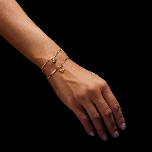Lämmin versio Tiny Tuvstarrin Tähtirannekorusta, valmistettu 925 sterlinghopeasta ja päällystetty 18 karaatin kullalla. Pieni tähti tuo mieleen hämärässä veden yllä kimaltelevan valon – hienovarainen, mutta täynnä läsnäoloa ja merkitystä.