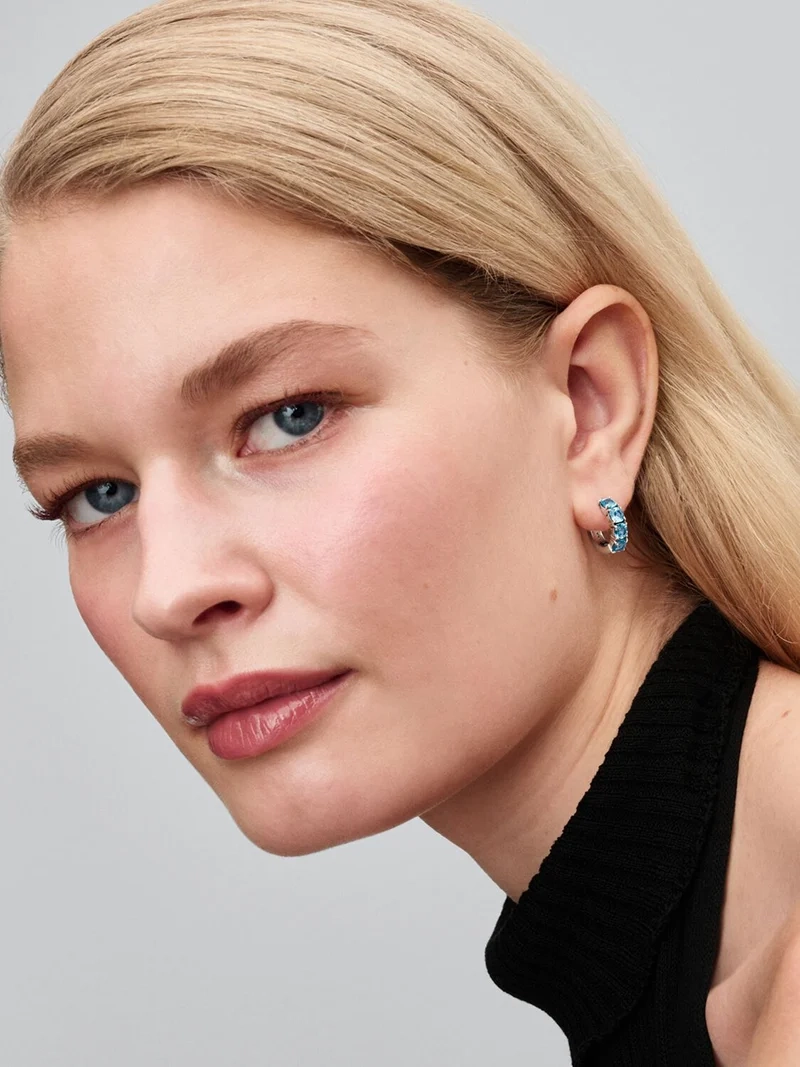 Nämä sterlinghopeiset korvarenkaat tuovat hienostuneen säväyksen mihin tahansa asukokonaisuuteen. Koristekristallien sävy on kaunis vaalea sinivihreä.